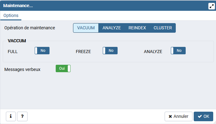 À noter que le VACCCUM est également disponible pour l'administrateur système sous forme de la commande système vacuumdb.