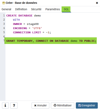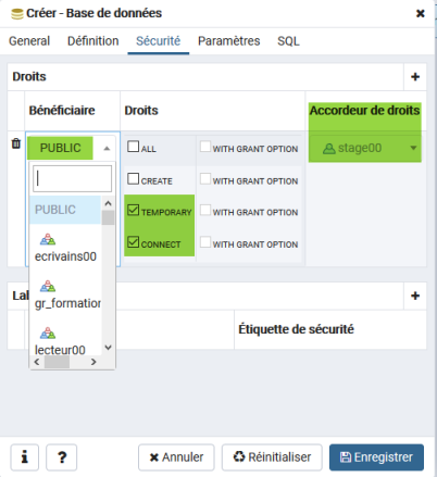 Dans l'exemple ci-dessus, tous les utilisateurs peuvent se connecter à la base en cours de création et créer des tables temporaires (sélection des options TEMP et CONNECT pour le groupe public).