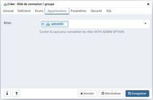 Indiquer dans l'onglet appartenance du rôle qu'il est membre de admin00 et cocher la case WITH ADMIN OPTION comme le montre l'image ci-contre.