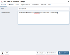 COMMENT ON ROLE ecrivains00 IS 'droits d''écriture dans le schema producteur de la base droit00';