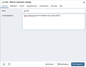 COMMENT ON ROLE gary00 IS 'gary Scherman est le fondateur du projet QGIS !';