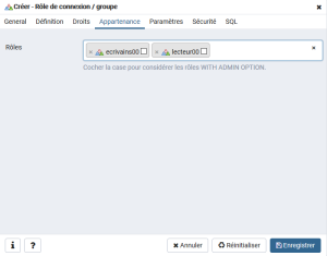 Indiquez dans l'onglet appartenance du rôle qu'il est membre de ecrivainsXX et de lecteurXX